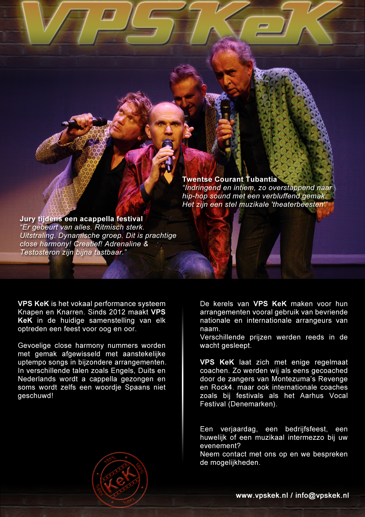 VPS KeK, vocal performance system Knapen en Knarren, maakt sinds 2012 in de huidige samenstelling van elk optreden een klein feestje. Gevoelige nummers worden met gemak afgewisseld met aanstekelijke uptempo songs in bijzondere arrangementen. In verschillende talen zoals Engels, Duits en Nederlands wordt gezongen en soms wordt zelfs een woordje Spaans niet geschuwd! De kerels van VPS KeK maken zelf arrangementen of maken gebruik van bevriende nationale en internationale arrangeurs van naam.